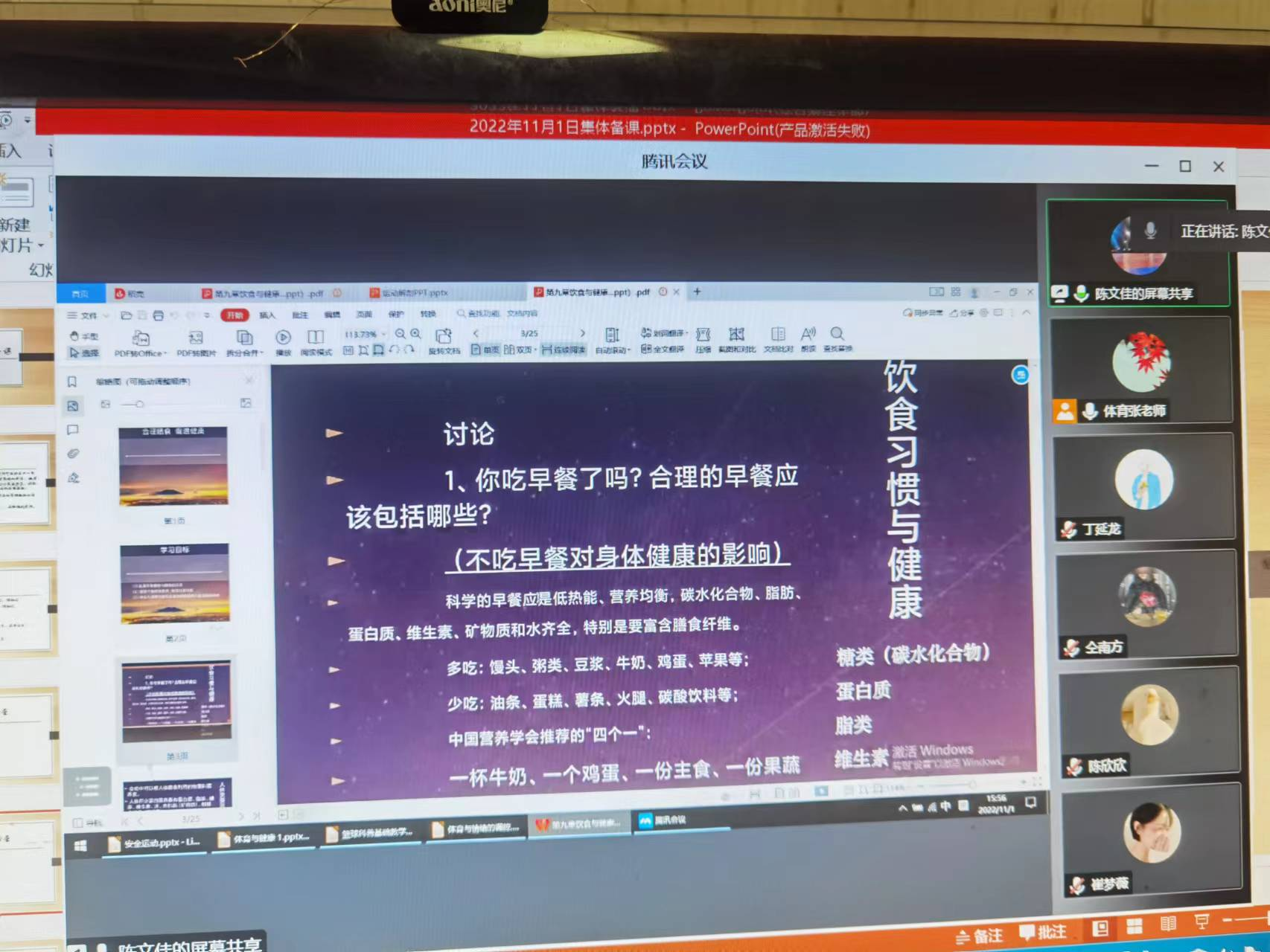会上,全体老师秉承着把学生培养成身心健康、体魄强健、意志坚强、充满活力的德智体美劳全面发展的高素质人才这个原则,围绕本学期教学任务分享了各自的教学经验与授课技巧,白阳老师用图片、视频、各种小常识以及自己声情并茂的讲解把古代奥林匹克的缘起到现代奥林匹克的蓬勃发展在学生面前展开了一幅历史的画卷;丁延龙老师带着“线上教学如何抓住学生的眼球?”“如何远程把控课堂,提高学习兴趣”这些问题走进线上教学课堂;张艳佳老师线上教学不忘课程思政,用“女排精神”激励学生,克服焦躁情绪,静下心来好好学习。体育课从线下的技术技巧练习转为线上的理论学习,同学们很不适应,为了让大家学好体育起源与发展知识,时楠茜老师上课时把学生分成不同的小组,根据老师的讲解制作体育发展史线路图;评一评,看一看,选出最佳作品;为了缓解学生长时间坐着造成的肩颈腰背不适,赵四林老师带着学生在教室有限的空间里进行八段锦练习;崔梦薇、陈欣欣几位老师带领学生合理利用教室场地做一些小游戏以活跃课堂气氛,提高学生的学习兴趣;郭婷婷、陈文佳老师从健康教育入手,图文并茂地给学生们展示了不吃早餐对身体健康的影响,通过讨论的形式让同学们知道合理的早餐应该怎么吃?吃什么?等等;李丽老师则从课前到课中课后利用智慧课堂教学平台,围绕教学任务给学生进行头脑风暴、即时问答、以及腾讯会议的白板功能对学生进行知识传授,提高了他们的学习兴趣。