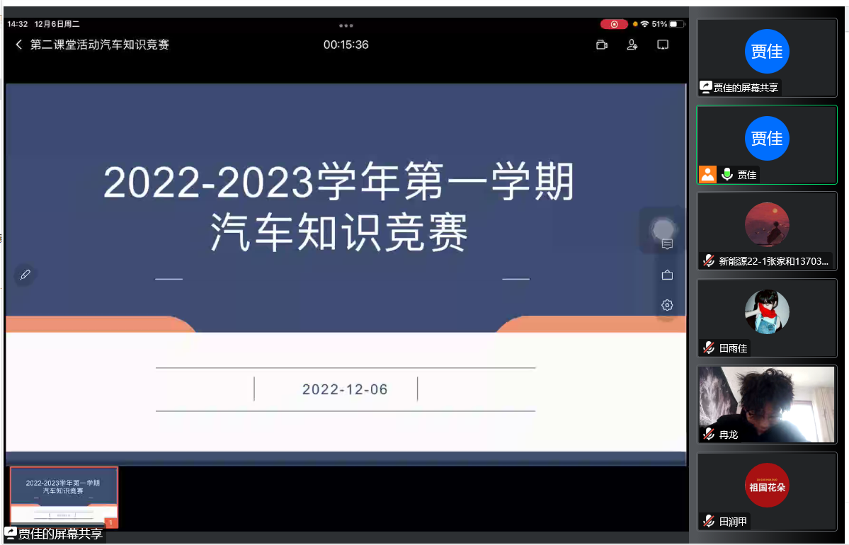 为丰富学生课余生活,拓展专业学习内容,检验专业教学效果,机电工程系按照第二课堂活动计划,近期组织实施了汽车类专业第二课堂活动。通过报名和选拔,12月6日下午,以网络会议形式进行汽车知识竞赛活动,徐辉主任组织活动,李曜副主任、班主任孙江军、乔琪、田雨佳,专业教师贾佳、董建庄、康凯、夏宗桃、何琤瑞参与活动,汽车类专业参赛学生40名。