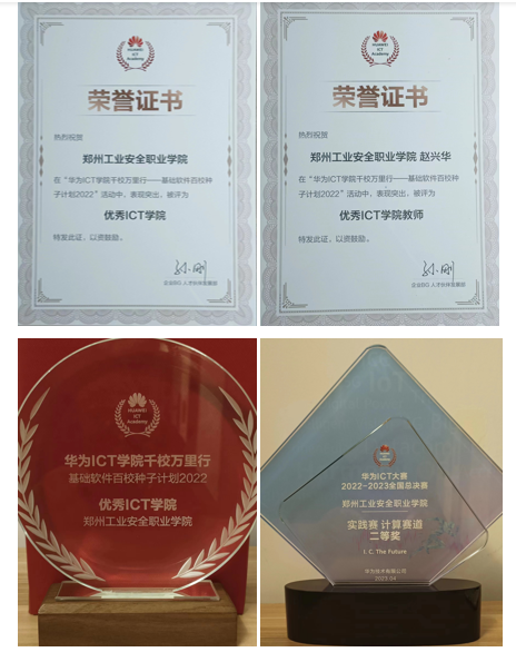 合作企业河南汇盛集团赵兴华老师由于在竞赛的卓越表现荣获“2022年优秀华为ICT学院教师”奖;合作企业河南合众信泰荣获“华为ICT大赛2022-2023最佳合作伙伴”“华为ICT学院千校万里行-基础软件百校种子计划2022优秀HALP”奖项。