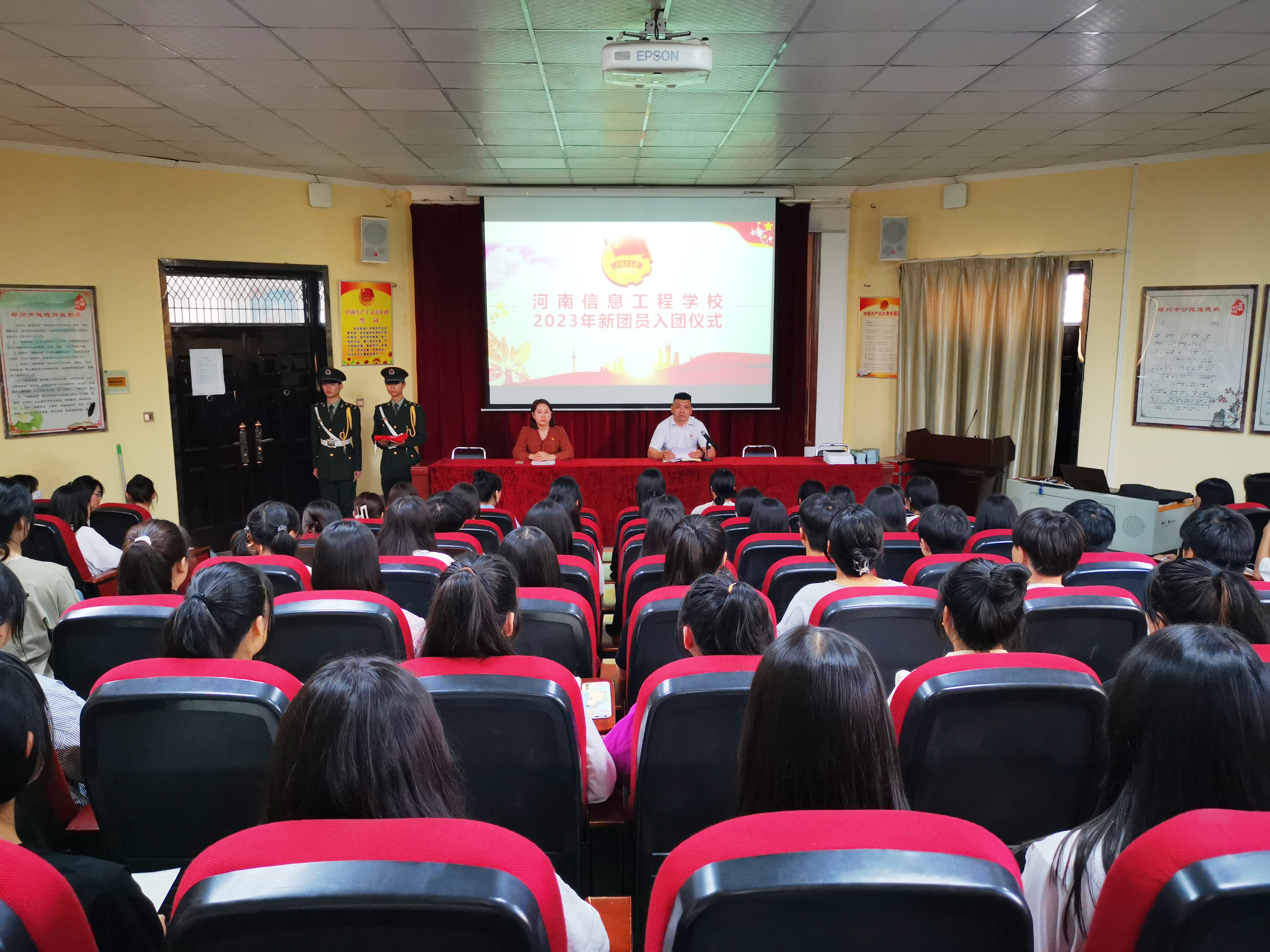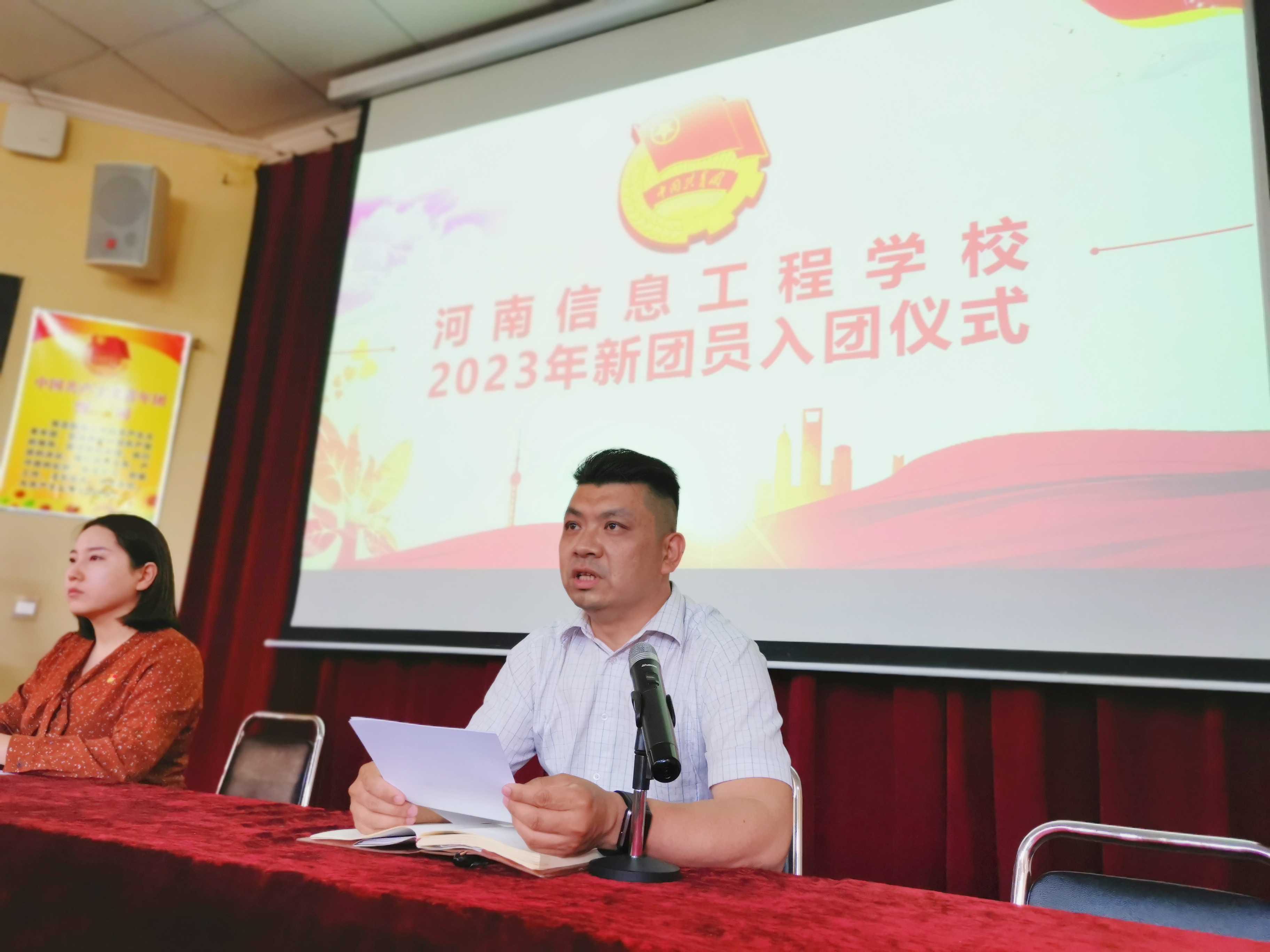校团委屈化冰书记宣读了《河南信息工程学校2023年发展团员决定》并致辞,他讲到:“党的助手和后备军”是中国共青团的政治定位和根本价值所在,各位新团员从佩戴上团徽那一刻起,就要认清自己肩负的责任,努力履行团员的义务,要坚定理想信念,听党话、跟党走,铭记初心使命,争当时代先锋,用实际行动来表明自己无愧于“共青团员”这个光荣称号。他还给新团员提出三点希望,一是要弘扬爱国主义精神,厚植爱国情怀,以建设中国式现代化为己任,勇做走在时代前列的奋进者;二是要坚定理想信念,培养高尚道德品质,树立远大理想目标,做走在时代前列的开拓者;三是要树立终身学习的观念,提升综合素养,德技兼修,脚踏实地,做走在时代前列的奉献者。此外,为更好地引导新团员了解共青团组织,团委马浩琼老师向全体新团员宣读了团员的权利和义务。
