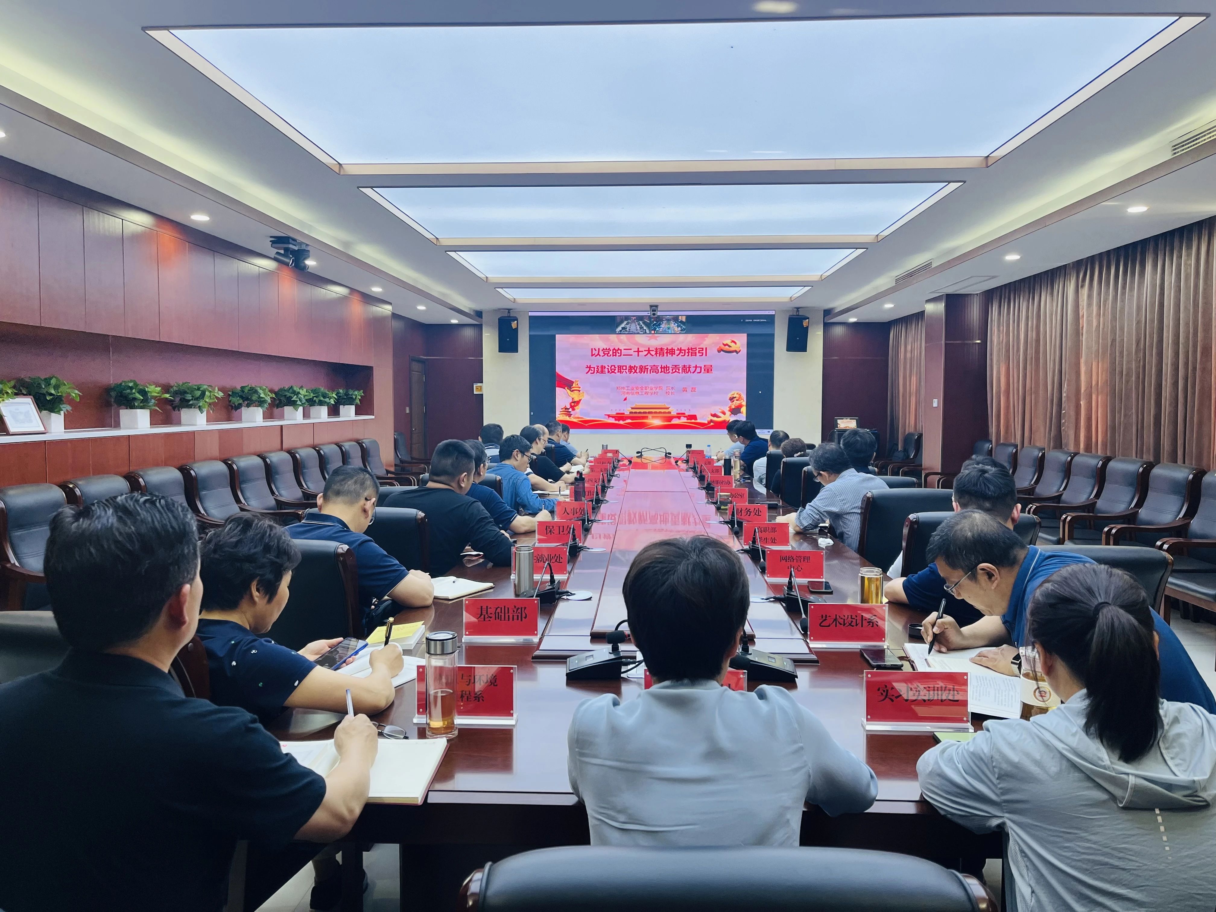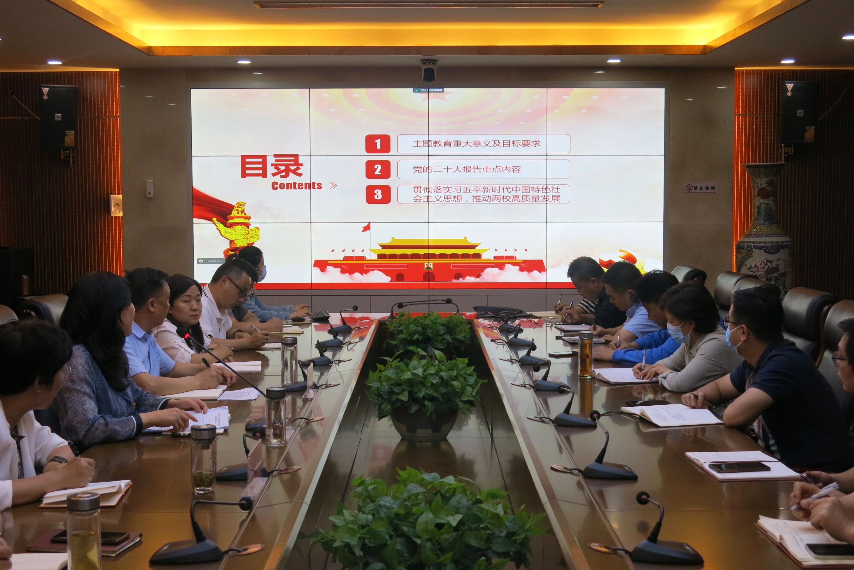 为推动学习贯彻习近平新时代中国特色社会主义思想主题教育走实走深,根据两校主题教育工作安排,6月6日下午,校长黄磊以《以党的二十大精神为指引 为建设职业教育新高地贡献力量》为题,讲授主题教育专题党课。党课主会场设在北校区行政楼六楼会议室,南校区办公楼一楼第一会议室设分会场,两校领导班子、全体中层干部参加了学习。