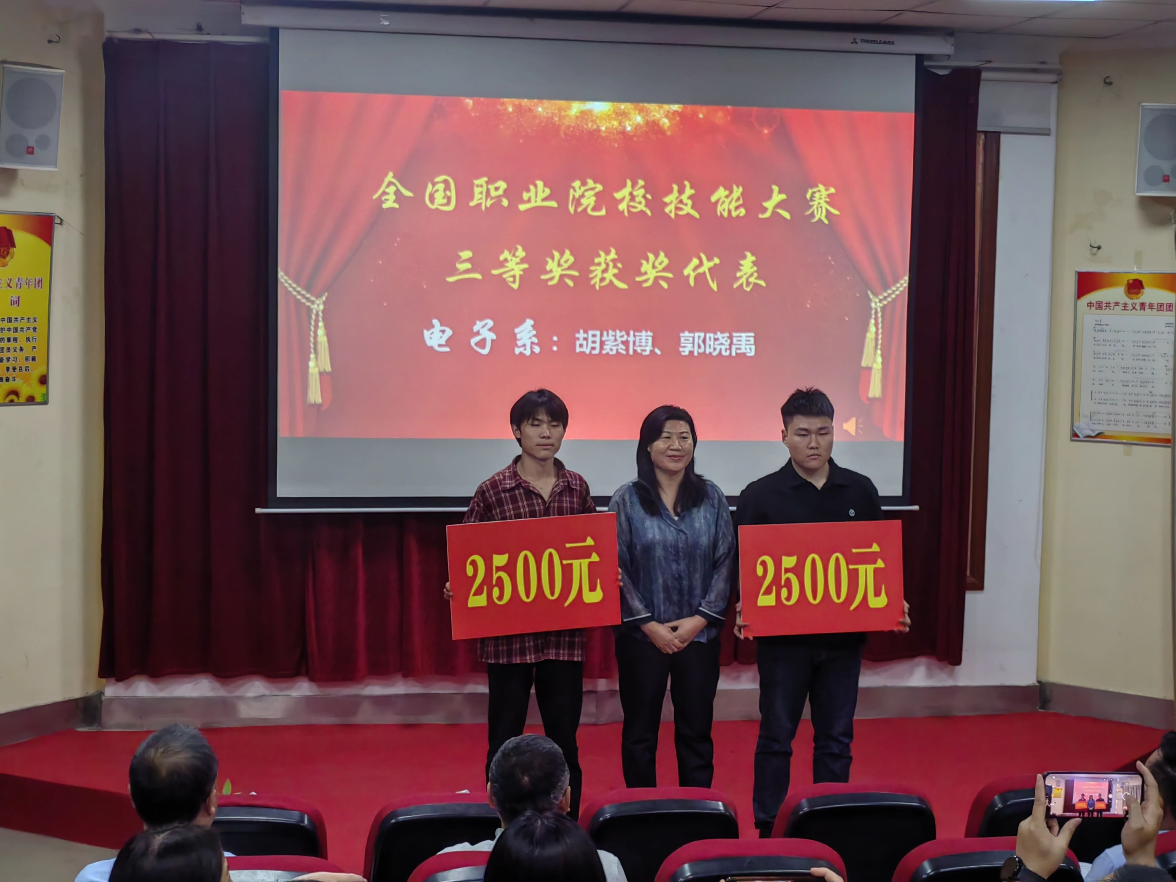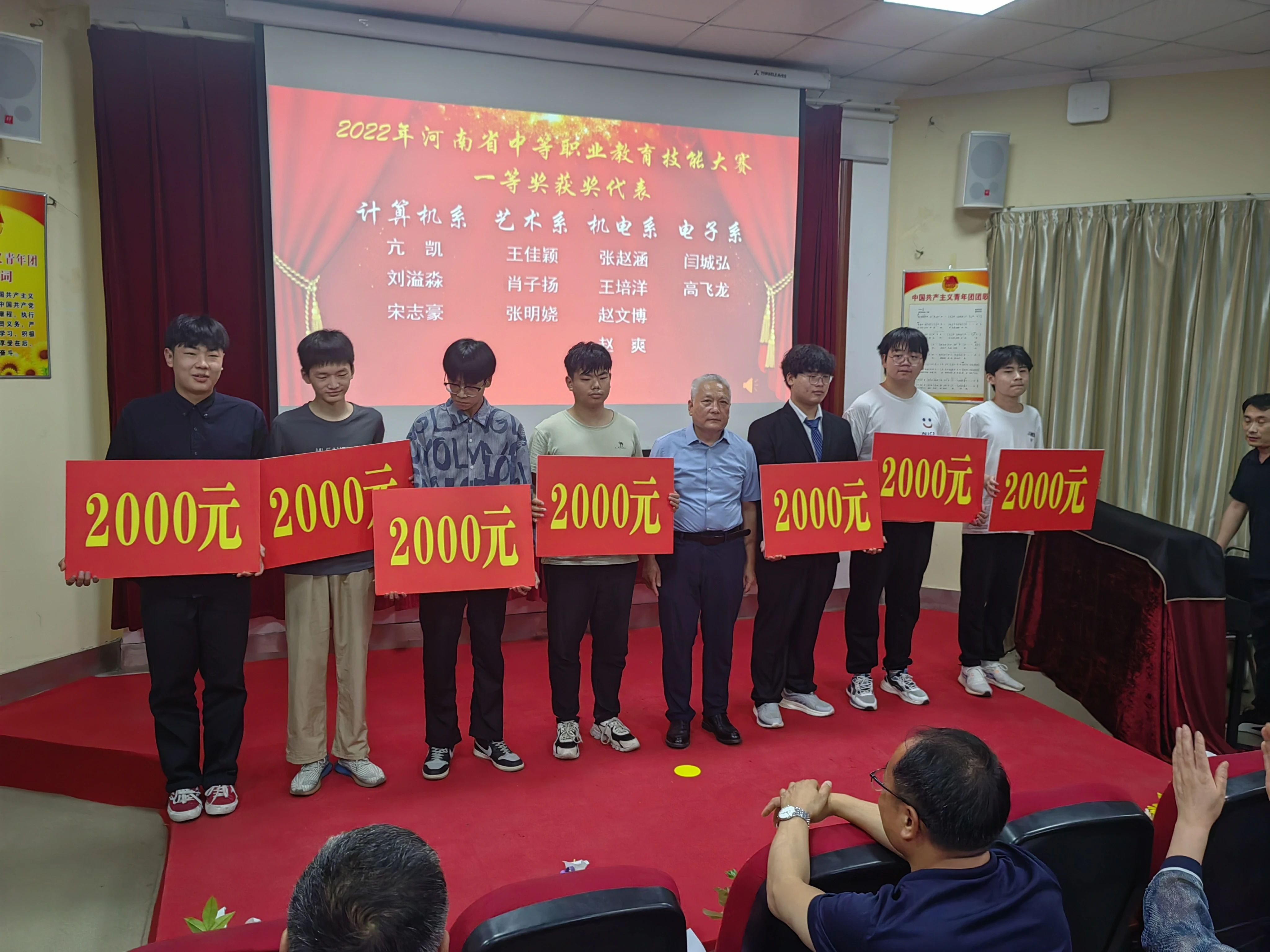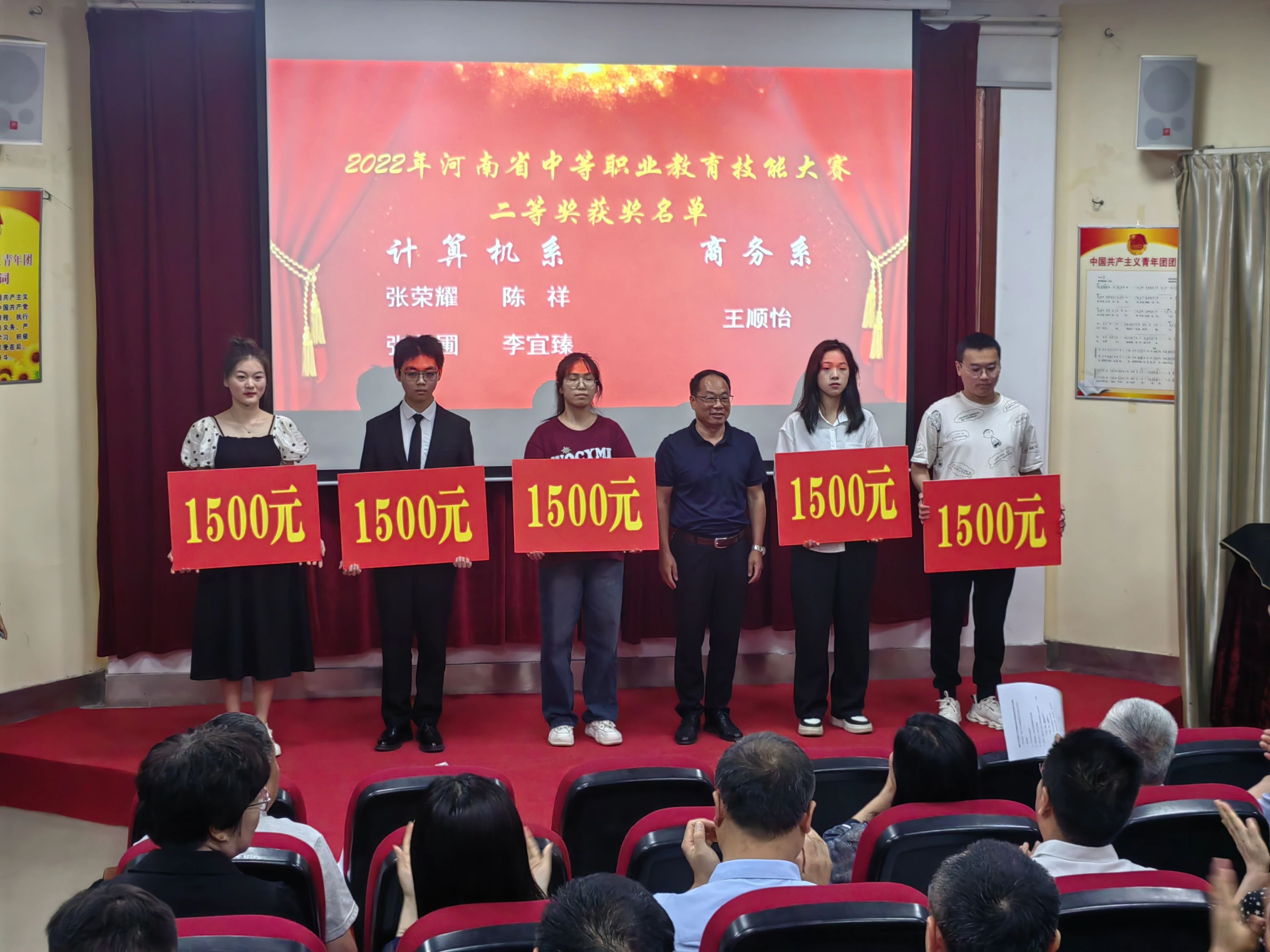 颁奖环节是本次表彰大会的核心内容和中心环节,也是最激动人心的环节。我校有着优良的竞赛传统、拼搏的竞赛精神、丰富的竞赛智慧和强大的竞赛团队,曾为河南省捧回十二枚全国职业院校技能竞赛金牌,堪称河南省的竞赛功勋学校。本届职业技能文化节以竞赛活动为载体,全校学生全覆盖,30多个赛项同步启动,全面铺开,最终1680人次荣获一二三等奖。我校学生参加2022年全国及河南省职业教育竞赛活动同样硕果累累,其中文明风采类竞赛共获一等奖 15个,二等奖16个,三等奖 12个;技能竞赛共获一等奖 21个,二等奖18个,三等奖 18个。表彰大会依次为本届职业技能文化节一等奖、2022年度省“文明风采”类竞赛、2022年度省技能竞赛和2022年度全国技能竞赛获奖学生代表颁发获奖证书和奖金。其中,全国技能大赛三等奖,电子系胡紫博、郭晓禹,每人奖金2500元;省技能竞赛一等奖,计算机系宋志豪、亢凯、刘溢淼,机电系张赵涵、王培洋、赵文博、赵爽,艺术系王佳颖、肖子扬、张明娆、李美琪,电子系闫城弘、高飞龙,每人奖金2000元;省技能竞赛二等奖,计算机系陈祥、张荣耀、张苗圃、李宜臻,商务系王顺怡,每人奖金1500元。此外,还有不少同学获得1000、600、300元等不同金额的奖金。