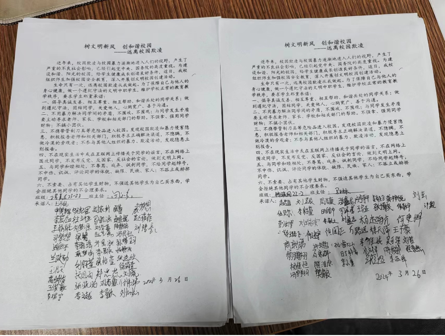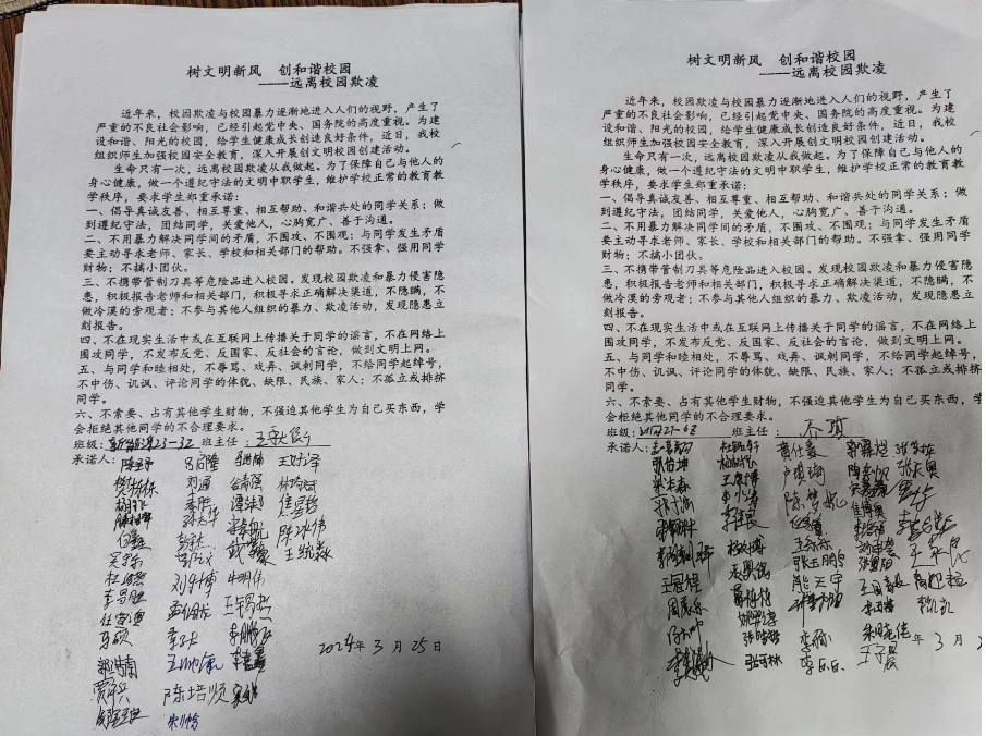 各班利用班会、自习时间,首先由班主任讲解了校园欺凌的危害性和严重性,并向同学们公布了校园暴力和校园欺凌举报二维码和信箱,鼓励同学们积极向善、和谐相处,在遇到校园欺凌时勇敢说“不”,遇事冷静、明辨是非,不做校园暴力的帮凶,理智对待同学之间出现的矛盾,有问题及时向家长、老师寻求帮助 ,提高自我保护意识,杜绝校园欺凌,学校对校园欺凌坚决做到零容忍。最后同学们在承诺书上郑重签名。