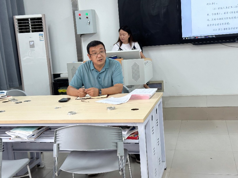 随后,系主任李强对本次迎新工作做了总结性发言。他首先对前期准备工作给予了充分肯定,并感谢所有参与人员的辛勤付出。李强主任指出,新生报到工作是展示系部形象的重要窗口,要求大家继续发扬团结协作的精神,确保迎新工作圆满成功。他还特别提到学生志愿者在迎新工作中的重要作用,鼓励他们以积极的态度和良好的风貌为新生提供帮助和服务。