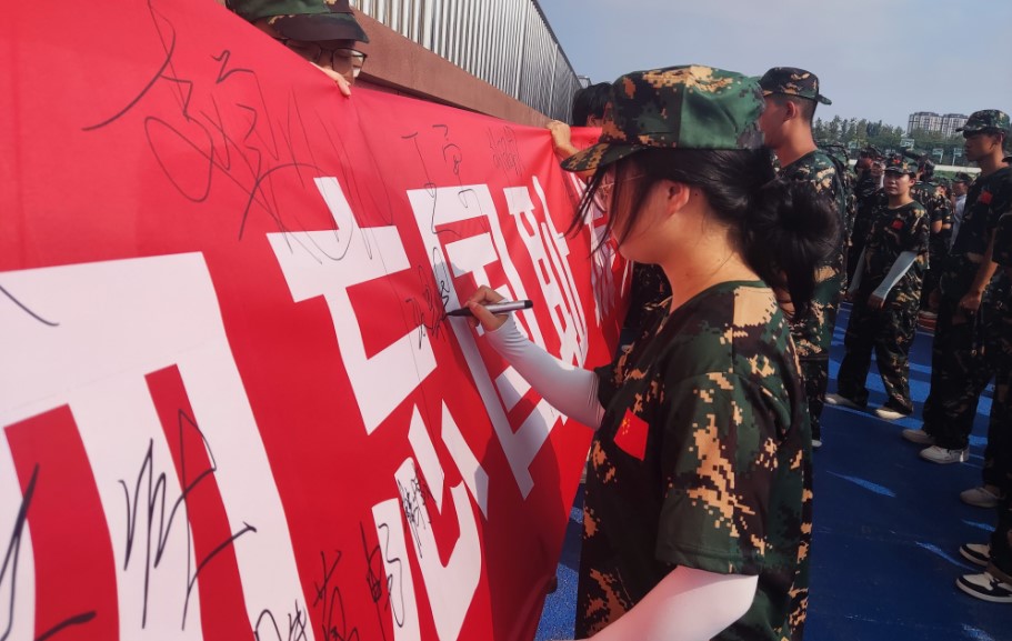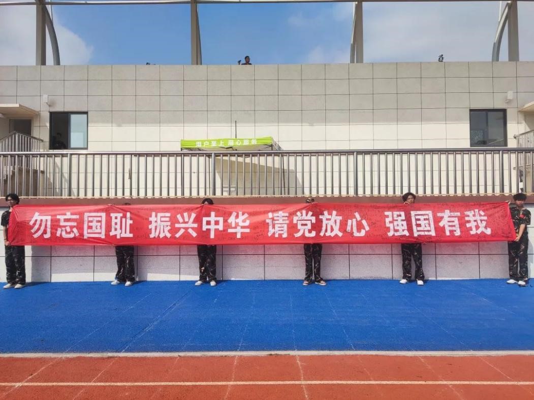 在老师的带领下2023级各班新生代表纷纷在印有“勿忘国耻 振兴中华 请党放心 强国有我”的横幅上郑重地写下了自己的名字。郑安学子继承着先烈的遗志,用我们浓浓的爱国之情向历史证明,请党放心,强国有我。