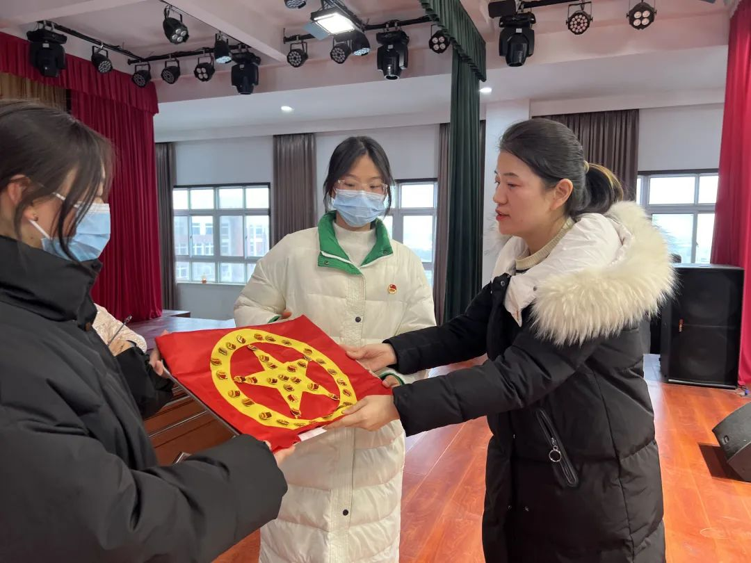 李丹老师为新团员代表授团旗。新团员面向团旗庄严宣誓,立志做好党的后备军。