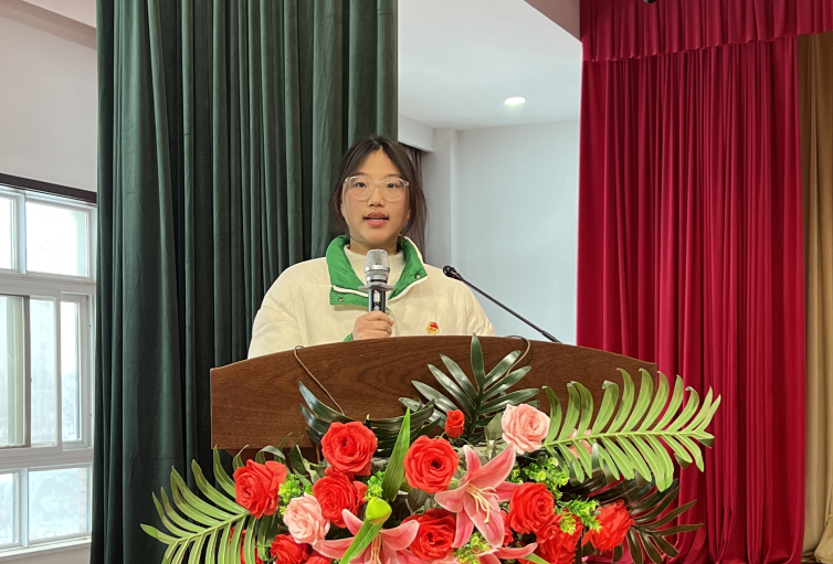 高职信息工程系网络技术22-4班卢梦珂同学作为老团员代表发言,她向新团员发出号召,要在团组织的领导下,脚踏实地,虚心学习,不断进取,真正从思想上加入到团组织中去,以实现自己的入团誓言。