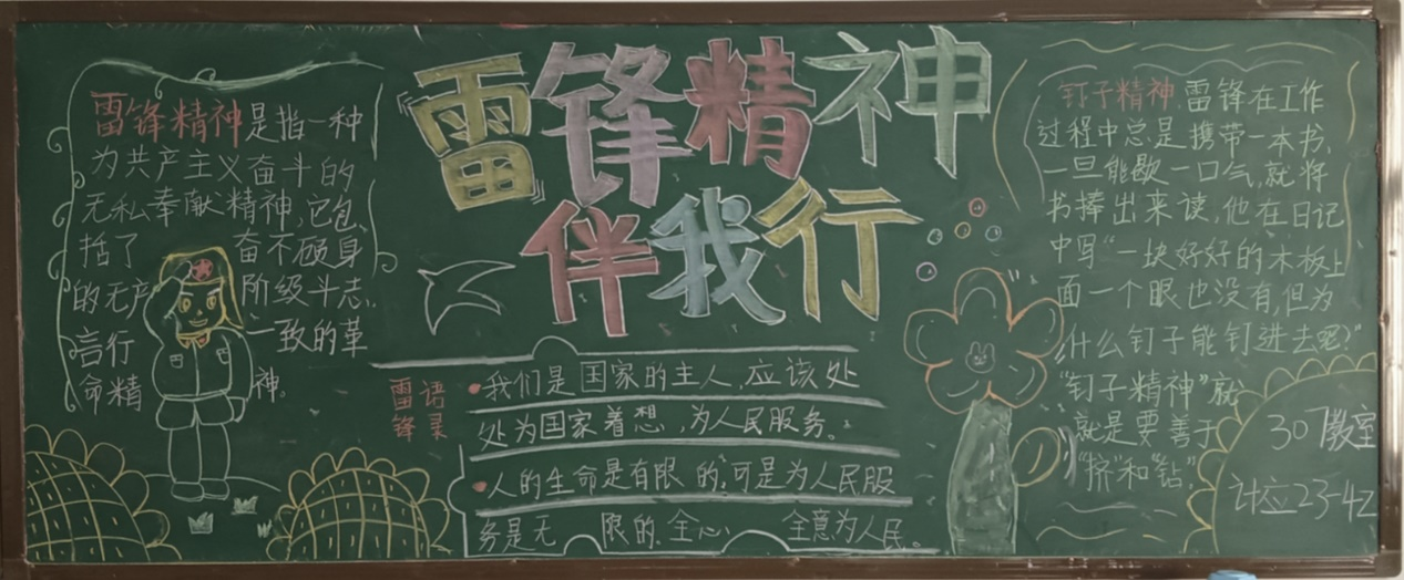 3月19日,北校区开展了弘扬雷锋精神主题板报评比活动。作为广大团员和青年自我宣传、自我教育的主阵地,每个班的黑板报都充满了青春活力,展现了同学们对雷锋精神的深刻理解和对美好未来的期许,激励着同学们努力成为新时代雷锋精神的传播者、弘扬者和践行者!