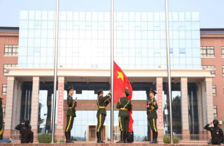 早上7:20,迎着朝阳,国旗广场上师生整齐列队,黄磊为国旗护卫队授旗。国旗护卫队的同学们迈着铿锵有力的步伐,护送国旗至升旗台前。伴随着激昂雄壮的国歌声起,全场师生肃立同唱,鲜艳的五星红旗冉冉升起,迎风飘扬。