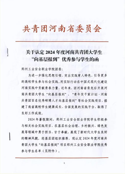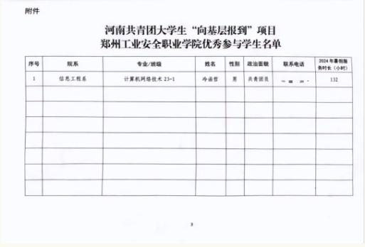 近日,共青团河南省委员会印发《关于认定2024年度河南共青团大学生“向基层报到”优秀参与学生的函》,2024年暑假期间,我校学生积极参加“向基层报到”等相关社会实践项目,在基层社会治理、乡村振兴、绿色发展等领域中勇于担当,甘于奉献,展现了新时代大学生良好的精神风貌,受到了团省委的肯定,我校信息工程系网络技术 23-1班冷函哲同学被团省委认定为“优秀参与学生”。