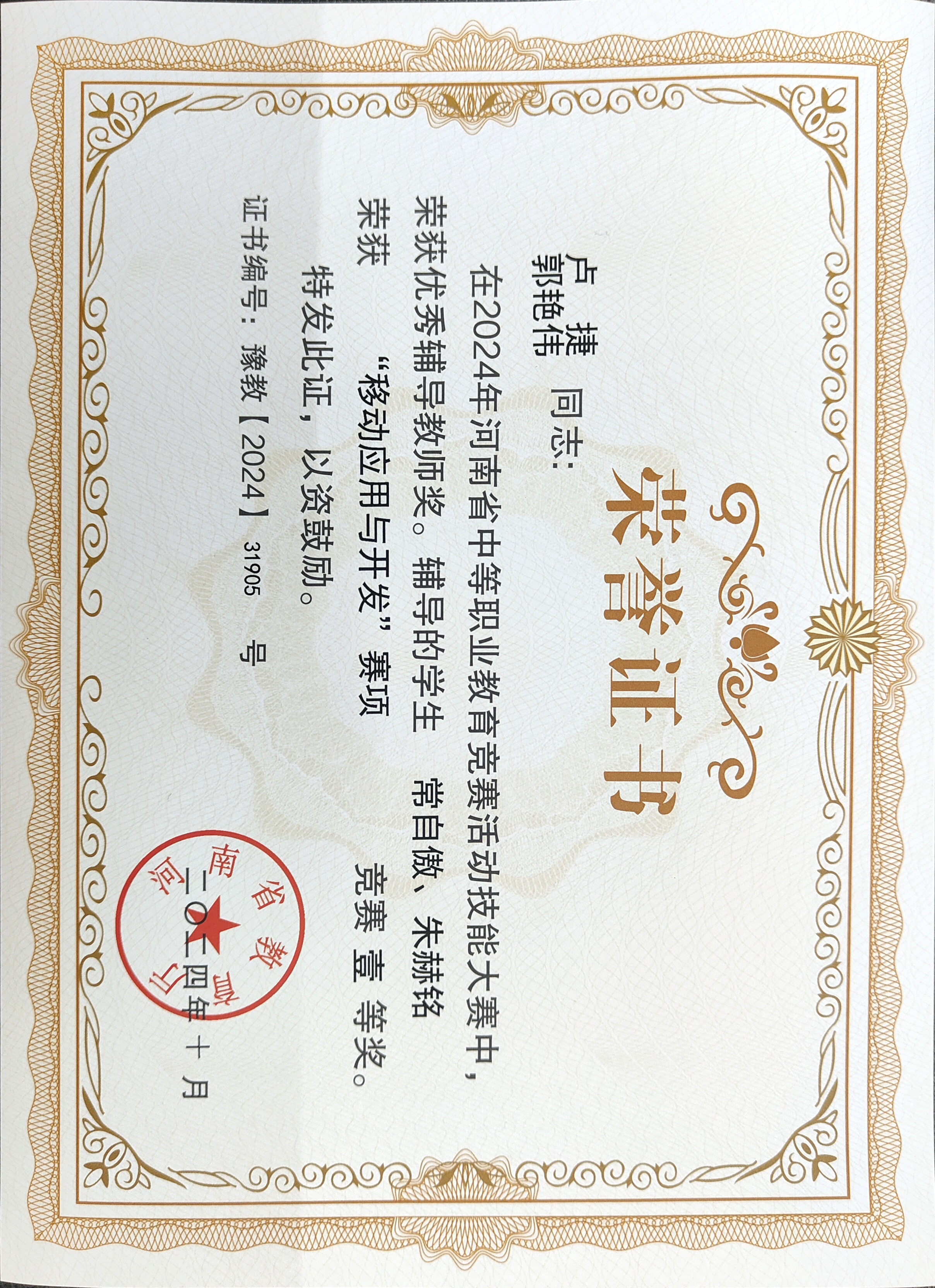 10月25日,2024年河南省赛中等职业教育技能大赛信息技术类“移动应用与开发”项,在河南省经济管理学校举行。我校软件技术系的参赛选手常自傲、朱赫铭同学,经过6个小时的赛场拼搏,在众多代表队中脱颖而出,取得了一等奖的好成绩。他们的出色表现不仅展现了个人才华和专业技能,更为我校赢得了荣誉。这次获奖是对两位参赛选手长期坚持努力学习的最好回报,也是他们未来学习和职业道路上的重要里程碑,必将激励他们在信息技术领域不断探索、创新,为实现自己的梦想和目标努力奋斗。同时,我们也希望同学们能够以他们为榜样,积极进取,追求卓越。再次向常自傲、朱赫铭同学表示热烈的祝贺!
