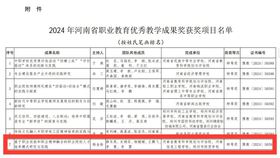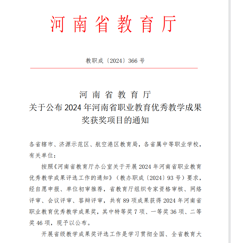 近期,河南省教育厅发布了《河南省教育厅关于公布2024年河南省职业教育优秀教学成果奖获奖项目的通知》(教职成〔2024〕366号),公布了2024年河南省职业教育优秀教学成果奖获奖项目名单,我校成绩显著,由我校教师主持的项目获得两项一等奖,我校作为第二参与单位的项目获得一项特等奖。