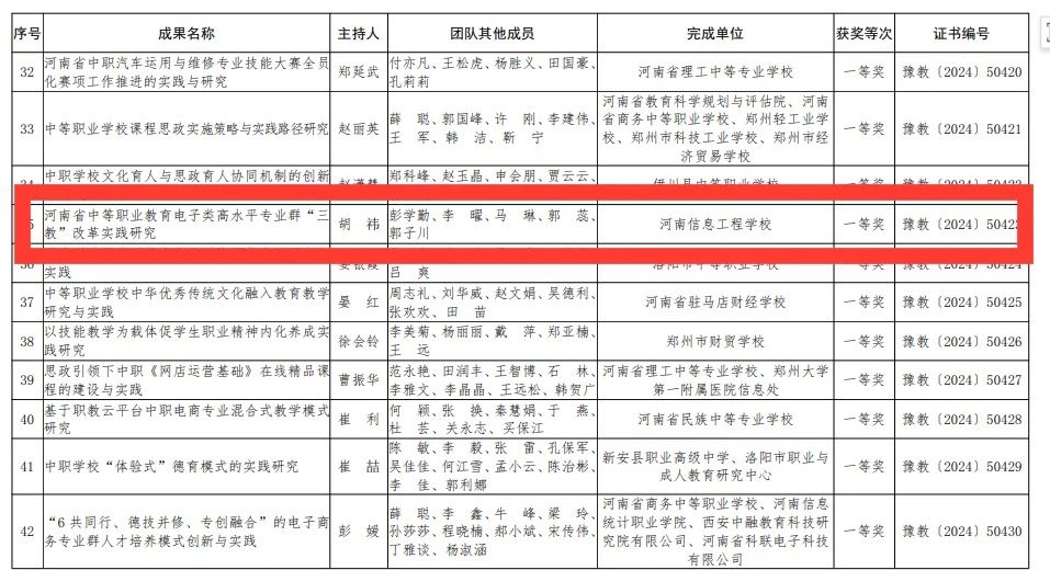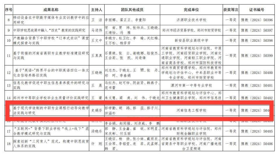 我校作为第二参与单位,薛东亮和史娟芬参与的《基于职业技能和职业精神融合的职业院校人才培养模式研究与实践》获得特等奖,由史娟芬主持的《基于现代学徒制的中职专业课程行动导向教学法实践与研究》项目、胡祎主持的《河南省中等职业教育电子类高水平专业群“三教”改革实践研究》项目,均荣获一等奖。