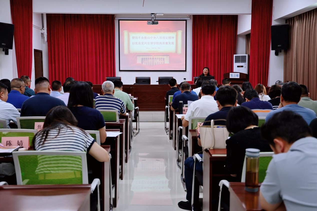 6月28日上午,我校党委书记黄磊以“锲而不舍推动中央八项规定精神,以优良党风引领学校高质量发展”为题在新郑校区第二会议室讲授深入贯彻中央八项规定精神学习教育专题党课,全体中层干部、党支部书记等参加党课学习。
