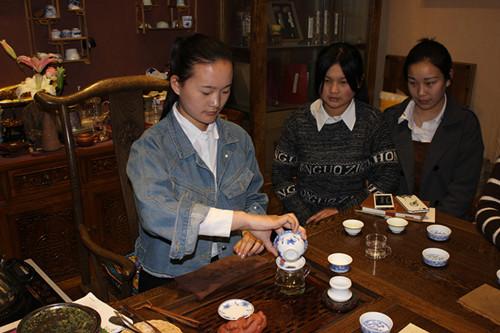 按照我校国示范重点专业旅游服务与管理的建设要求,为加深学生对茶艺课理论的理解,提高实操能力,熏陶行业精神,我系3月26日、27日上午分别安排14-6班、14-5班学生在班主任吴顺顺、外聘茶艺教师张冰宇、我系教师娄本杰、崔可等的带领下前往北茶城进行了为期半天的茶艺课实训学习。同学们在装修雅致的茶店里,实地分组学习了选茗、择水、烹茶、茶具、环境创设等一系列内容,通过沏茶、赏茶、闻茶、饮茶的实际操作,将课堂上枯燥抽象的理论知识与生动形象的茶艺活动相结合,使同学们充分领略了茶性清纯、幽雅、质朴的气质,领悟了茶文化的博大精深,极大地激发了学习兴趣。